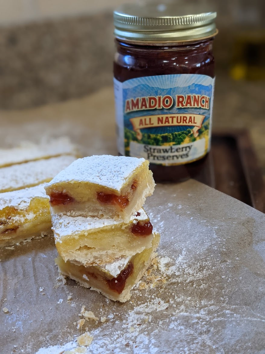 I love, love, love lemon squares. With a perfectly buttery crust and a tangy, tart and subtly sweet custard, these treats are perfect with a cup of tea! To throw a new spin on this traditional treat, I like to add dollops of jam which adds a touch of sweetness and flavor. As with a lot of recipes, you want to use a high-quality jam or fruit preserve so that the flavor of the fruit shines through instead of just the added sugar. The best thing about citrus squares is that you can experiment with different citrus flavors! Here are some flavor combinations I suggest using with Amadio Ranch naturally made fruit preserves: